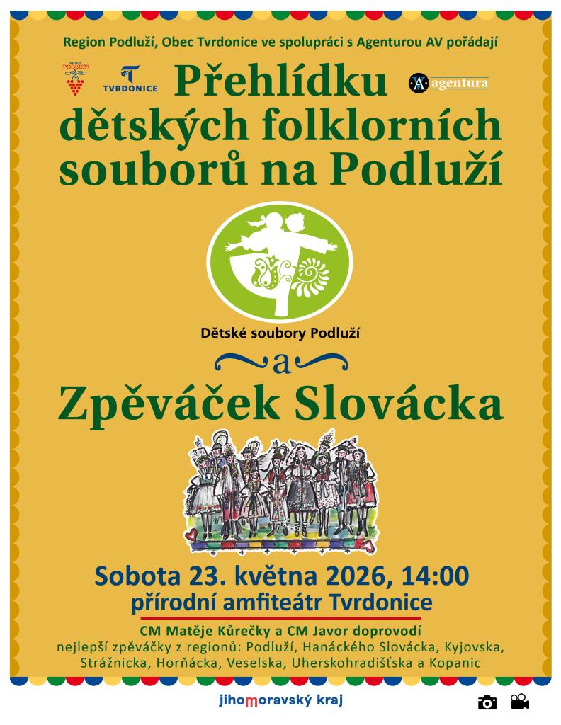 Obec Tvrdonice a Agentura AV vás zvou na 4. Přehlídku dětských folklorních souborů na Podluží. Akce se uskuteční v sobotu 23. května 2026 od 14:00 v přírodním amfiteátru v Tvrdonicích. Vystoupí zde dětské soubory z regionu Podluží a další oblasti, které představí své tradiční folklorní tance a písně. Můžete se těšit na doprovod CM Matěje Kůrečky a CM Javor, kteří podpoří nejlepší zpěváčky z různých regionů, jako je Hanácké Slovácko, Kyjovsko a další.