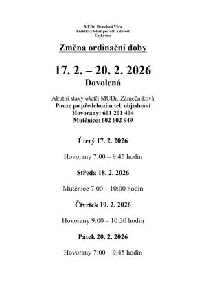 V termínu od 17. do 20. února 2026 bude mít MUDr. Věra Demelová dovolenou. Akutní stavy ošetří MUDr. Zámečníková, a to pouze po předchozím telefonickém objednání na číslech 601 201 404 pro Hovorany a 602 602 949 pro Mutěnice. Viz přiložený leták.
